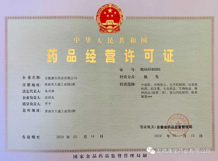2019年5月23日,安徽省藥品監督管理局正式將重新認證后的《藥品經營質量管理規范認證證書》、《藥品經營許可證》頒發給康寶藥業,標志著我公司順利通過此次GSP認證檢查。